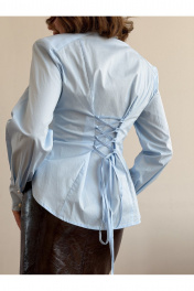 Блузка из хлопка,приталенного кроя,по спинке регулируется завязками. Рост модели 168 см. Длина -70 см, рукав-62 см, обхват груди-94 см, обхват талии-86 см.