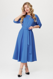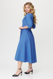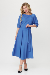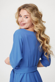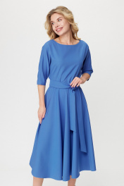 Платье нарядно-повседневное из плотной плательной ткани. Отрезное по талии. Лиф «летучая мышь» с цельнокроеным рукавом, зауженным к низу. Летящая юбка «полусолнце», по талии эластичная тесьма. Низ юбки разноуровневый (перед и спинка длиннее боковых). Без застежки. Горловина овальная. Пояс длинный, завязывается на талии в два оборота. Длина юбки от талии 75 см. Длина рукава от горловины 43 см.