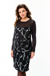 Нарядное платье из комбинированного трикотажного полотна : черный меланж «Волна» и плотная сетка с блеском. «Ах, какая женщина, какая женщина...» Платье полуприлегающего силуэта, с кокеткой по переду. Горловина овальная, рукав втачной длинный. Спинка со средним швом. Отделка из декоративной тесьмы по горловине, линии переда и низу рукава. Платье без подкладки. Длина размер 46-50 90 см. Длина размер 52-56 98 см. Длина рукава 58 см.