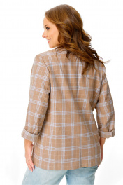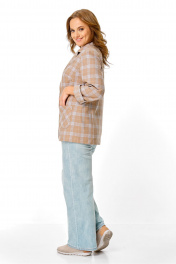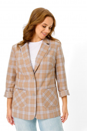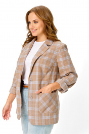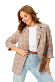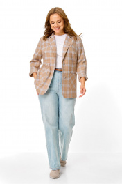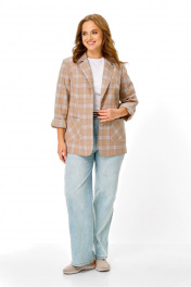 Свободный облегченный жакет выполнен из натуральной хлопковой ткани в актуальном цветовом сочетании капучино с небесным голубым. С воротником и лацканами, застегивается на петли и пуговицы. Накладные карманы по переду. Рукав длинный втачной двушовный.. Жакет без подкладки. Длина жакета: 69 см. Длина рукава: 61 см. Объем по груди размер 48 104 см размер 50 108 см размер 52 112 см размер 54 116 см Состав ткани : хлопок 95%, спандекс 5%