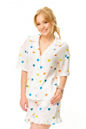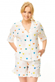 Летний «романтичный» комплект из воздушного муслина «сердце». Воздушная блузка-рубашка из ткани «муслин» в модном сердечном дизайне. Воротник и лацканы закругленной формы. Застегивается на петли-пуговицы по переду. Плечо спущено. Рукав короткий. По бокам разрезы. Длина размер 44-48 57 см 50-54 60 см Длина рукава с плечом 43 см Свободные шорты с высокой посадкой на талии, с глубокими карманами, по поясу резинка. Без застежки. По низу воланчик. Длина без пояса размер 44-48 38 см. 50-54 43 см Окружность по талии размер 44-64-74 см 46-68-78 см 48-72-82 см 50-78-88 см 52-84-94 см 54-88-98 см