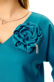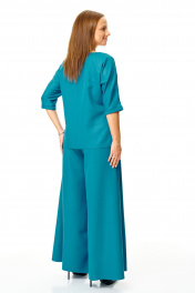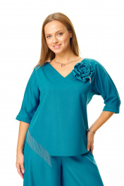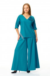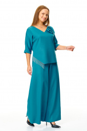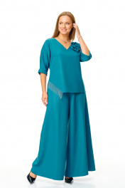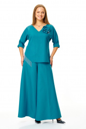 Самый лучший комплект для любого торжества! Не сковывает движения, стройнит. Брючный комплект из плотной плательной ткани с легким блеском со съемным цветком. Свободная блуза с ассиметричным разрезом, с отделкой из металлизированной тесьмы «цепочки». Крой «мышь». Рукав 3/4. По низу рукава манжета. Длина 61 см размер 46-50 Длина 64 см размер 52-56 Длина рукава от горловины размер 46-50 42 см. Длина рукава от горловины размер 52-56 43 см. Обхват по груди размер 46-100 см 48-104 см 50-108 см 52-112 см 54-116 см 56-120 см Струящиеся брюки с высокой посадкой на талии широкие к низу, молния сзади, по поясу резинка. Длина брюк 102 см. Ширина брюк по низу 47-50 см в сгибе Окружность по талии (резинка не растянута) размер 46-68-78 см 48-74-84 см 50-78-88 см 52-84-94 см 54-88-98 см 56-92-102 см