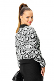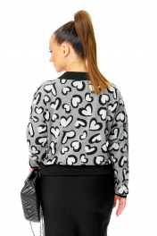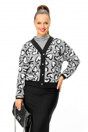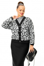 Стильный трикотажный укороченный кардиган в современном сочетании дизайн «сердце» и черного. Кардиган из уютного мягкого трикотажа, свободного силуэта, застегивается на пуговицы. Планка горловины и манжеты из трикотажа «рубчик». Плечо спущено. Рукав длинный. Длина размер 44-48-55 см Длина размер 50-54-60 см Длина рукава с плечом 73 см ( длина плеча 27 см).