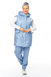 Комплект 2-х предметный: жилет и брюки. Комплект для ранней весны из воздушного жилета и брюк из бархатистого микро-вельвета в нежном цвете. Удлиненный жилет с глубоким капюшоном на легком утеплителе синтепон. Застежка на кнопки. По переду накладные карманы с клапаном. Низ затягивается на кулиску. Жилет на подкладке. Длина размер 52-54 78 см Окружность по груди размер 44-46 116 см 48-50 120 см 52-54 124 см Удобные брюки из микро вельвета с высокой посадкой на талии, с глубокими карманами, по поясу резинка. Длина брюк 93 см без учета пояса. Окружность по талии :размер 46-70 см-100 см 48-74 см-104 см 50-78 см-108 см 52-84 см-112 см 54-88 см-116 см