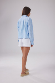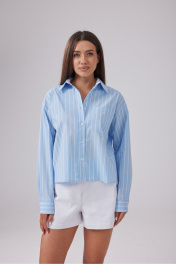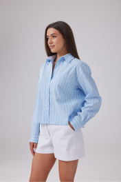 Рубашка свободного кроя и укороченной длины, выполнена из полотна голубого цвета в полоску. Отложной воротник, карамн по переду, центральная застежка на петли и пуговицы. Рукав спущен, по низу рукава широкий манжет. Длина по спинке 54 см, длина рукава от края горловины 77 см