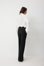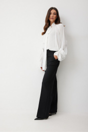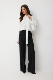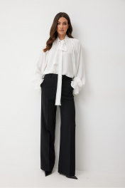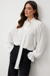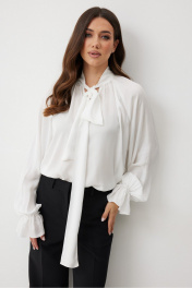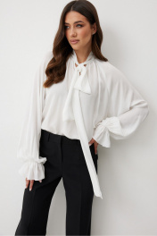 Женская блузка свободного силуэта из струящейся ткани — идеальное решение для создания романтичного и непринужденного образа. Вырез горловины округлый с с небельшим разрезом по переду. Воротник-стойка переходит в длинные завязки-ленты, которые вы можете завязать бантом или оформить любым другим способом. Рукав реглан, снизу рукава сборка на резинке и широкий волан. Эта блузка станет идеальной основой как для офисного, так и для вечернего или повседневного образа, добавляя ему нотку утонченной небрежности. На фото с брюками М380. Промеры в 44 размере: длина по спинке - 64 см длина рукава от горловины (с воланом 10 см) - 80 см ПОГ - 59 см ПОБ - 70 см