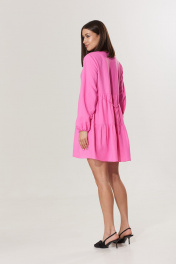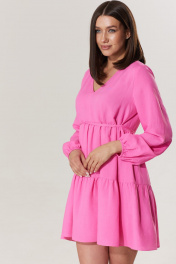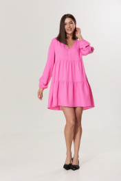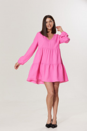 Романтичное платье свободного кроя А-образного силуэта, выполнено из яркого полотна с двумя ярусами на сборке. В боковые швы на линии талии для приталивания (по желанию) вставлены завязки. Рукава втачные, низ рукава собран на эластичную тесьму шириной 1см . Горловина V-образной формы. Длина изделия по спинке 87 см, длина рукава 63 см.
