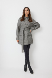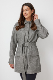 Платье-рубашка женская, длиной мини. Платье полуприлегающего силуэта, выполнено из плотного хлопкового полотна серого цвета. Вырез горловины округлый, воротник рубашечного типа. Застежка центральная на петли и пуговицы в скрытой планке. По полочке на уровне груди и на уровне бедер накладные карманы. Линия плеча расширена, рукав спущен. Рукава длинные, втачные одношовные, с широкой манжетой по низу. Спинка с талиевыми вытачками. В комплекте пояс на полукольцах из основной ткани.. Длина изделия по спинке 82 см, длина рукава 52 см.