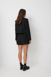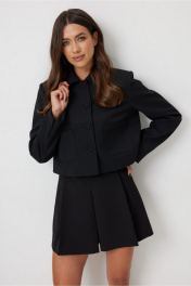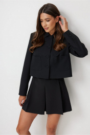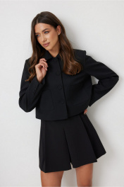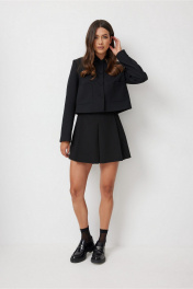 Юбка-шорты А-образного силуэта, выполнены из костюмной ткани. Пояс притачной со шлевками, застегивающийся на петлю и пуговицу. Закрытая застежка на молнии. По переднему полотнищу складки, имитирующие юбку. Карманы прорезные. Длина изделия по боковому шву 42 см. Юбка-шорты составят стильный образ с жакетом М664.