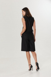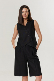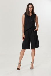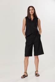 Шорты женские длины миди, выполнены из черного льняного полотна. Центральная застежка на пуговицу и молнию, по переду карманы. Длина изделия по боковому шву 61 см