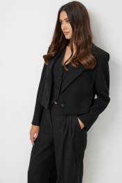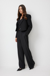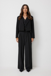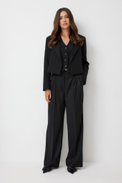 Брюки женские, широкие прямые, с высокой посадкой. Выполнены из костюмной ткани черного цвета. В боковых подрезах по переду функциональные карманы. Пояс притачной со шлевками, застегивается на петлю и пуговицу. Застежка на тесьму-молнию. По переднему полотнищу встречные складки. Длина брюк по боковому шву с поясом 113 см. Брюки составят стильный образ с жакетом М664 или жилетом М502.