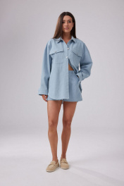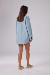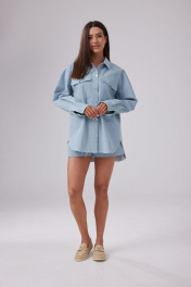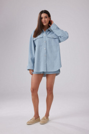 Рубашка женская свободного силуэта, выполнена из джинсового полотна голубого цвета. Вырез горловины округлый, воротник отложной. Застежка центральная на петли и пуговицы. По полочке на уровне груди накладные карманы с клапаном. Линия плеча спущена. Рукава втачные одношовные, длинные. По низу рукава манжета, застегивающаяся на петлю и пуговицу. Спинка прямая, с отрезной кокеткой сверху. Низ рубашки не обработан. Длина изделия по спинке 80 см. Длина рукава 52 см.