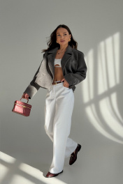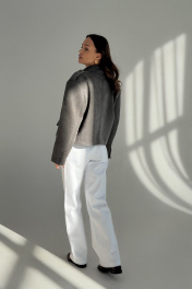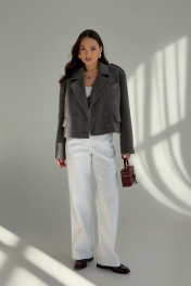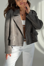 Укороченный жакет из плотной трикотажной ткани в широкий рубчик. Жакет прямого силуэта. Застежка двубортная на петли и пуговицы. Вырез горловины V-образный с классическим пиджачным воротником с лацканами. По полочке на уровне груди декоративная листочка. На уровне талии прорезные карманы с клапаном. По линии плеча декоративный элемент с пуговицей. Рукава втачные длинные, одношовные, снизу рукава шлица с застежкой на пуговицы. Спинка со средним швом. Жакет на подкладке.