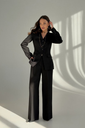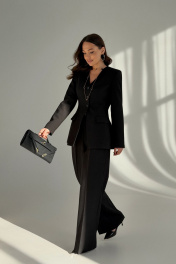 Женский жакет полуприлегающего силуэта выполнен из текстильной ткани и станет стильным дополнением к любому гардеробу. Вырез горловины V-образный, без лацканов. Застежка центральная на петли и пуговицы до линии талии. Полы жакета к низу чуть расходятся. По полочке функциональные прорезные карманы с клапанами. Рукава втачные длинные, одношовные, снизу рукава шлица с застежкой на пуговицы. Спинка со средним швом снизу, которого шлица. Жакет на подкладке. На фото модель представлена в комплекте с брюками М388.