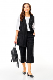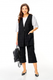 Комплект женский тройка состоит из жилета, брюк и футболки. Жилет и брюки выполнены из льняной ткани с геометрическим рисунком, футболка из вискозного полотна. Жилет прямого силуэта до линии бедер с центральной застежкой на одну пуговицу. Нагрудные вытачки от вертикального рельефа, карманы накладные в нижней части полочек. Горловина V-образная, без воротника. По спинке средний шов, нашивка с вышивкой в верхней части спинки. Пройма углубленная без рукавов. Брюки прямые, свободные, укороченные (примерно до середины икры), пояс притачной с резинкой по спинке и шлёвками. Застежка гульфик с молнией. В боковых швах карманы. Футболка свободного покроя, плечо спущенное, горловина округлая, обработана планкой, перед и спинка цельные, рукав втачной, короткий, свободный.