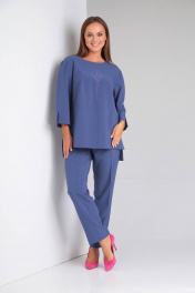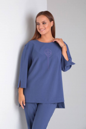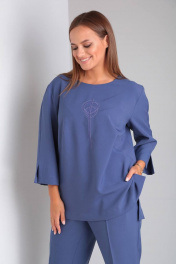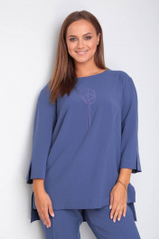 Комплект женский выполнен из плательно-костюмной однотонной ткани, состоит из брюк и блузона. Брюки слегка зауженные к низу на притачном поясе с резинкой. В боковых швах имеются функциональные карманы. Блузон свободного покроя, по спинке средний шов с застёжкой сверху на потайную молнию. По переду вышивка. В боковых швах блузона разрезы, спинка длиннее переда на 8 см. Горловина округлой формы. Рукав двухшовный 3/4 по низу разрез. Блузон: Длина спинки 74 см Длина рукава 45 см Брюки: Длина сбоку 103,5 см