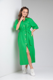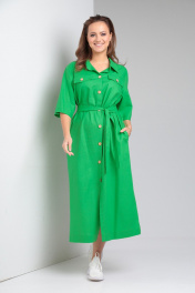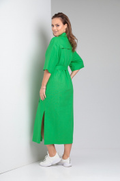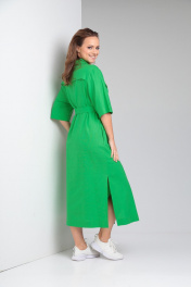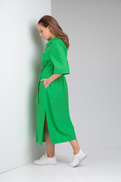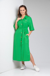 Женское платье свободного покроя из однотонного льна. По переду центральная застежка на петли-пуговицы. Нагрудные вытачки из бокового шва, кокетка выше уровня груди с отделочными клапанами. Спинка цельная, кокетка. В боковых швах функциональные карманы и разрезы. Воротник рубашечного типа на стойке. Рукав втачной со спущенной линией плеча. К комплекте сьемный пояс из основной ткани. Длина по спинке 122 см. Ширина изделия на уровне глубины проймы в 48р 60 см, в 50р 62 см, в 52р 64 см, в 54р 66 см. Длина рукава 33 см. Ширина изделия по линии талии в 48р 58 см, в 50р 60 см, в 52р 62 см, в 54р 64 см. Ширина изделия на уровне линии бедер в 48р 61 см, в 50р 63 см, в 52р 65 см, в 54р 67 см.