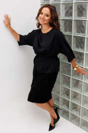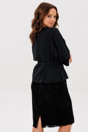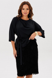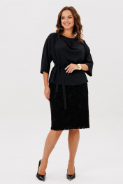 Комплект женский состоит из блузки и юбки. Блузка с цельнокроеным рукавом длиной 3/4. От правого плеча идут мягкие складки к центру переда. Застежка по центру спинки на петлю и пуговицу. По бокам небольшие разрезы. Блузка с поясом. Юбка на поясе выполнена из кружевного полотна на подкладке из основной ткани. На поясе по бокам эластичная тесьма. По среднему шву задней половинки юбки молния, снизу разрез 13,5 см. Состав кружева: полиэстер 55%, нейлон 45% Длина блузки по спинке в 48 и 50 рр 56 см, в 52-56 рр 58 см. Ширина изделия на уровне глубины проймы в 48р 58 см, в 50р 60 см, в 52р 62 см, в 54р 64 см, в 56р 66 см. Длина рукава от горловины 48 см. Ширина изделия по линии низа в 48р 54 см, в 50р 56 см, в 52р 58 см, в 54р 60 см, в 56р 62 см. Длина юбки 60 см. Ширина юбки по талии в 48р 43 см, в 50р 45 см, в 52р 47 см, в 54р 49 см, в 56р 51 см. Ширина юбки на уровне линии бедер в 48р 55 см, в 50р 57 см, в 52р 59 см, в 54р 61 см, в 56р 63 см.