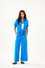 Современный женский гардероб сложно представить без идеально сидящего на фигуре брючного комплекта! Он остается неотъемлемой частью гардероба не только деловых женщин, но и тех, кто ценит комфорт, практичность и стиль. Комплект состоит из блузы и брюк. Блуза удлиненного силуэта с центральной бортовой застежкой на петли и пуговицы. Брюки свободной формы без застежки, по поясу резинка . В боковых швах брюк-карманы.