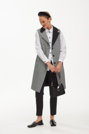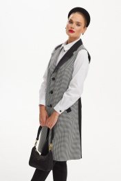 Элегантный и стильный женский модный костюм поражает своей изысканностью и неповторимым стилем. Основой этого образа является удлиненный жилет, который подчеркивает женскую фигуру и придает образу изысканности, узор гусиная лапка добавляют дополнительную изюминку и оригинальность этому наряду. Сочетание классического кроя и современного дизайна делает этот костюм идеальным выбором для деловых встреч, вечеринок или других мероприятий, где важно выглядеть стильно и элегантно.