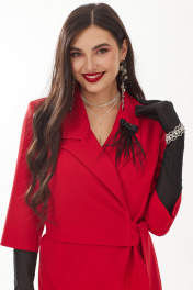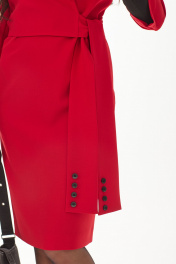 Платье полуприлегающего силуэта, выполненное из плательно-костюмной ткани, длиной миди. Одна из деталей лифа - отлетная, имитирующая образ комплекта "жакет и платье". Перед платья с нагрудными вытачками. Верхняя, жакетная часть платья завязывается на фигурный пояс, декорированный пуговицами. Спинка со средним швом и талиевыми вытачками. В нижней части среднего шва спинки обработана шлица. В левом боковом шве расположена потайная молния. Рукав втачной, двухшовный. Горловина платья оформлена воротником жакетного типа. В комплект входит дизайнерская брошь ручной работы.