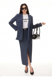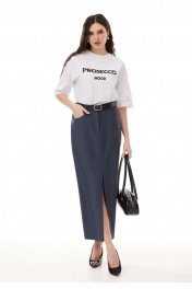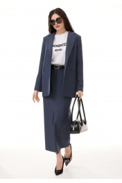 Костюм женский 3-х предметный, состоящий из жакета, юбки и футболки. Жакет и юбка выполнены из костюмной поливискозы, футболка выполнена из хлопкового трикотажа. Жакет на контрастной подкладке из поливискозы. Жакет прямого силуэта, с центральной застежкой на две петли-пуговицы. Горловина оформлена воротником пиджачного типа, рукава двухшовные втачные. Спинка жакета со средним швом, по низу которого обработана шлица до линии талии. Перед жакета с нагрудными вытачками и прорезными карманами с листочками в области бедер. В области груди обработан прорезной карман с листочками, с декоративной патой, застегивающийся на петлю и пуговицу. Юбка классической формы, длиной maxi, cлегка заужена к низу. Верхний срез обработан притачным поясом с резинкой от бокового шва по задним половинкам. Застежка по переду на тесьму молнию, потайную пуговицу и крючок. Перед состоит из 4 частей, рельефы отстрочены декоративной строчкой. По низу центрального рельефа - разрез. Спинка юбки состоит из центральной части и бочков, с отстроченными отделочной строчкой рельефами. В верхней части переда обработаны фигурные карманы. В комплект входит съёмный ремень. Футболка прямого силуэта, со спущенной линией плеча и втачным рукавом. Горловина обработана обтачкой. В центральной части переда расположен качественный современный принт.