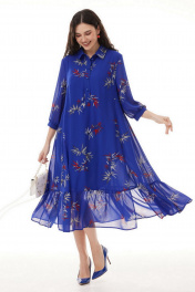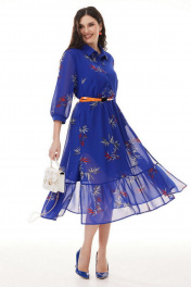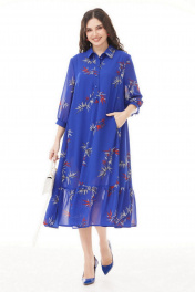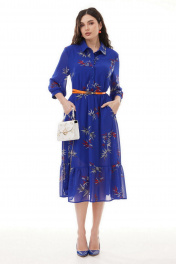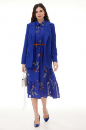 Комплект женский, состоящий из шифонового платья и классического жакета. Платье А-силуэта, на подкладке, длиной мидакси, выполненное из итальянского шифона с принтом. Платье с центральной планкой до линии талии, которая застегивается на петли и пуговицы. Горловина платья с воротником рубашечного типа. В передних рельефах, в области бедер обработаны карманы, по низу - разрезы. По нижней части платья - притачной волан. Рукав втачной, одношовный, по низу рукава - притачная манжета, застегивающаяся на петлю и пуговицу. Жакет выполнен из костюмной поливискозы на подкладке. Жакет прямого силуэта с намеком на полуприлегание, с застежкой на две петли и две пуговицы. Перед жакета с рельефами, нагрудными выточками и прорезными карманами с клапаном. Спинка жакета со средним швом. Горловина оформлена воротником пиджачного типа. В комплект входит декоративный контрастный ремень из экокожи. Сочетание жакета и платья — великолепный вариант для создания ансамбля в стиле элегантной повседневности. Весьма уместно здесь будут смотреться синие кожаные туфли на каблуке.