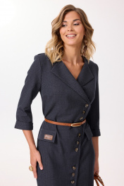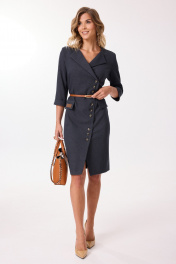 Элегантное платье полуприлегающего силуэта с асимметричной застежкой на петли и пуговицы. Перед платья с нагрудными вытачками и клапанами в области бёдер. На одном клапане, в качестве декора, — нашивка. Спинка с талиевыми вытачками и средним швом, внизу которого обработана шлица. Застежка асимметричная, двубортная, по низу платья расходится на разрез. В области плеч — погоны, закрепляющиеся на пуговицу. Рукава двухшовные втачные, длиной 3/4, с притачной манжетой. Платье с плечевыми накладками и со съёмным ремнем в цвет фурнитуры. Фурнитура (пуговицы и ремень) могут незначительно отличаться от представленных на фото. Данная модель — отличная идея стилизации для офисной работы и не только… В зависимости от аксессуаров оно подойдет и для многих других случаев. Платье отличается классической элегантностью в современной версии. Это именно то, что вы ищете, если вам важен имидж, стиль и классика.