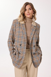Костюм женский 3-х предметный, состоящий из жакета, брюк и джемпера. Жакет выполнен из поливискозы с принтом "клетка". Жакет полуприлегающего силуэта, на подкладке, с двухбортной застежкой на петли и пуговицы. Горловина жакета оформлена воротником пиджачного типа. Воротник выполнен из отделочной ткани-компаньена. Рукава двухшовные длинные с возможностью подворота длины. Перед с нагрудными выточками, выходящими из рельефов. В области бедер обработаны прорезные карманы "в рамку" с клапаном. Спинка со средним швом и рельефами. Брюки прямого силуэта со стрелками по передним и задним половинкам. Выполнены из однотонной поливискозы. Верхний срез обработан притачным поясом. По центру переда - застёжка на крючок и тесьму-молнию. На задних половинках расположены талиевые вытачки и декоративные листочки. В боковых швах расположены наклонные карманы. Джемпер прямого силуэта, выполнен из 100% вискозы. Перед и спинка цельнокроенная. Рукав длинный. Горловина типа "водолазка". Длина изделия - середина бедра.