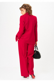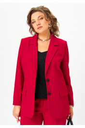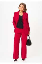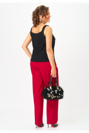 Комплект женский 3-х предметный, состоящий из жакета, топа и брюк. Жакет прямого силуэта, с застежкой на две петли и две пуговицы, на контрастной подкладке из поливискозы. Перед жакета с нагрудными вытачками и прорезными карманами с клапаном. Спинка жакета со средним швом. Рукава двухшовные втачные. Горловина оформлена воротником пиджачного типа. Брюки классической формы, прямого силуэта, со стрелками по передним и задним половинкам. Верхний срез обработан обтачным поясом. В боковых швах брюк обработаны наклонные карманы. Застёжка центральная на тесьму-молнию и крючок. В модели использована фурнитура контрастного цвета. Топ прямого силуэта на широких бретелях, выполнен из трикотажного полотна с люрексом. Перед с нагрудными вытачками. Горловина переда лёгкой V-образной формы. Спинка цельнокроеная. Комплект можно носить по раздельности, создавая множество стильных образов.