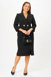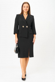 Платье прилегающего силуэта, длиной миди, выполненное из плательной поливискозы. Платье жакетного типа с ассиметричным передом. Одна из сторон переда имитирует жакет и юбку, другая-платье. Перед с талиевыми вытачками с подрезом. В области груди настрочена декоративная листочка, в области бедер - карманы-обманки с листочками и клапаном. По переду обработан разрез. В области талии расположена застёжка на 2 петли и крупные декоративные пуговицы. Спинка со средним швом, в который вставлена потайная молния. Рукав 2-х шовный втачной, длиной 3/4.