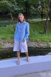 Голубая льняная рубашка свободного кроя на пуговицах Twok 200802 голубая