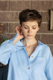 Рубашка из умягченного льна прямого, свободного кроя с закругленным низом. С широкими манжетами, классическим воротником-стойкой. Застежкой на пуговицы. Пуговицы натуральные кокосовые. По спинке складки навстречу друг другу, это позволет рубашке не натягиваться на бедрах. а спокойно ниспадать вниз. Все внутренние швы закрытые, поэтому, даже после многочисленных стирок швы рубашки остаются безупречными, никаких торчащих ниток. Умягченный лен отличается от обычного льна тем, что мнется не заломами, а естественной мятостью, которую можно даже не гдадить, при желании. Широкий манжет может быть застегнут, либо подвернут и, благодаря, закрытым швам смотрится аккуратно. Брюки палаццо с боковыми карманами на широкой резинке с шнурком с металлическими наконечниками . . Абсолютно универсальный комплект для любого гардероба и стиля. Уход за изделием: деликатная стирка с жидким моющим средством при температуре 30-40 градусов. S Рубашка: ширина 55 см, длина передней планки 66 см, длина спинки от плеча 72 см, длина рукава от горловины 72 см. Брюки палаццо ширина 50 см, длина внутреннего шва 76 см, длина резинки для талии 70 см М Рубашка: ширина 60 см, длина передней планки 67 см, длина спинки от плеча 73 см, длина рукава от горловины 74 см. Брюки палаццо ширина 55 см, длина внутреннего шва 76 см, длина резинки для талии 78 см L Рубашка: ширина 65 см, длина передней планки 70 см, длина спинки от плеча 75 см, длина рукава от горловины76 см. Брюки палаццо ширина 60 см, длина внутреннего шва 76 см, длина резинки для талии 82 см