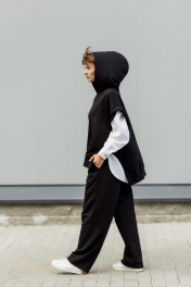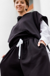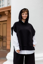 Комплект суперстильной дизайнерской жилетки с капюшоном черного цвета из премиального турецкого хлопка с белой рубашкой из умягченного льна и широких брюк SLACKS из футера 3хнитки. петля, качество пенье закрывает все базовые потребности - уместно на работе, стильно в кафе, удобно на прогулке. Уникальная выкройка Жилетки с капюшоном обеспечивает идеальную посадку обладательницам размеров от 42 до 52 (ростом от 160 до 180 см). Ширина Жилетки 65 см, высокие боковые разрезы идеально повторяют разрезы рубашки. Длина передней планки 65 см, спинки 72 см. Двухсторонний капюшон красиво выкладывается вокруг горловины и, надетый на голову, не тянет, а красиво обрамляет лицо. Рубашка белая из умягченного льна 44-46: Длина передней планки рубашки 69 см, длина изделия по спинке 75 см. длина рукава от воротника 73 см. Полуобхват в области груди 58 см. Рубашка белая из умягченного льна 48-50: Длина передней планки рубашки 72 см, длина изделия по спинке 78 см. длина рукава от воротника 75 см. Полуобхват в области груди 61 см. Широкие брюки SLACKS дадут вам ощущение полной свободы. Широкая простроченная резинка и хлопковая кулиска позволит вместить любую талию. Ширина в бедрах 65 см( объем 130 см), длина внутреннего шва 75 см Абсолютно универсальный комплект для любого гардероба и стиля. Уход за изделием: деликатная стирка с жидким моющим средством при температуре 30-40 градусов.