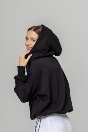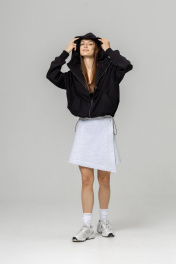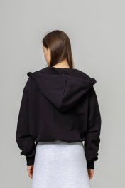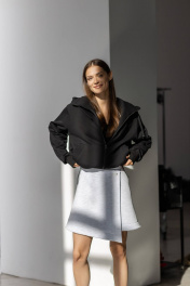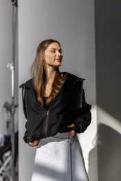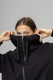 Бомбер с высокой горловиной и капюшоном выполнен из трикотажного полотна, который отлично держит форму и обладает исключительными теплорегуляторными функциями. Внизу по краю втянута резинка фиксатор, позволяющая затягивать низ бомбера либо оставлять свободно ниспадающим.Прорезные карманы на передней планке с обеих сторон декорированы широкой диагональной листочкой. Широкие рукава также снабжены внутренней резинкой с фиксатором, которую можно затянуть, чтобы регулировать длину бомбера. Длина изделия S /М- 60 см, длина рукава от горловины 78 см