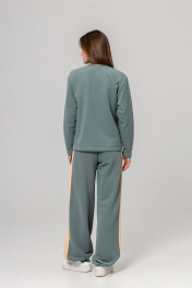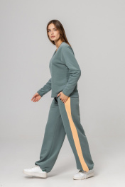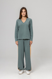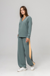 Костюм из футера с велюром( Джемпер с V-образной горловиной+ брюки палаццо с лампасами и фиксатором) выполнен из премиального турецкого футера 3х нитки с велюровым напылением, петля, качество пенье. Невероятная мягкость и пластичность материала -это особенное удовольствие, так как его не хочется снимать. Отличительная особенность этого футера заключается в прекрасной износостойкости и низкой сминаемостью, поэтому вы можете быть уверены в своем отличном внешнем виде, даже после длительного сидения. Модель джемпера с втачным рукавом, позволит носить его и с брюками и с юбками и, даже поверх платья-комбинации, такая модель не расширяет верхнюю часть тела и позволяет ткани струиться. V-образная горловинаудлиняет визуально шею и очень украшает образ. .Длина изделия у размеров S и М - 62 см от плеча вниз, у размера L - 68 см Длина рукава 72 см от горловины Нижний край выполнен из резинки кашкорсе, которая аккуратно заканчивает изделие, не стягивая его, но при этом создает форму. Брюки палаццо тренд этого сезона, они делают образ более стильным. Внизу в брюкх есть резинка-фиксатор, поэтому можно носить брюки прямыми либо затянутыми на резинку( особенно хорошо это в дождливую погоду, так как зафиксирорвав брюки, вы не дадите им загрязниться и вымочиться.Хлопковый шнур в поясе позволяет формировать оъем талии по мере необходимости. Абсолютно универсальное изделие для любого гардероба и стиля. Не образуются катышки на лицевой стороне изделия, цвет зделия остается ярким и насыщенным даже после 50 стирок. Уход за изделием: деликатная стирка с жидким моющим средством при температуре 30-40 градусов. При стирке использовать мягкие моющие средства. не применять отбеливающие средства.