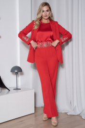 Костюм с вышивкой обладает особой элегантностью и эксклюзивностью. Благодаря вышивке деловой костюм становятся более женственным и изысканным. Костюм женский трёхпредметный состоит из удлиненного жакета полуприлегающего силуэта с вышивкой на рукаве, брюк и блузы. В комплект к брюкам идет съемный пояс с вышивкой расшитой декоративными камнями. Жакет женский из костюмно-плательной ткани, удлиненный, полуприлегающего силуэта, на подкладке, с центральной бортовой застежкой на 2 петли и пуговицы. По переду жакет с талиевой вытачкой, выходящей из горизонтального подреза расположенного чуть ниже линии талии, в котором обработан прорезной карман "в рамку" с клапаном. Один угол клапана - закругленный, другой заостренный - идет на продолжение бокового шва. В верхней части переда на левой половинке настрочена листочка, несет декоративную функцию. Спинка с рельефными швами, выходящими из проймы до низа и средним швом. Горловина обработана отложным воротником пиджачного типа. Углы лацкана заостренной формы. Линия борта внизу закругленная. Рукава втачные двухшовные, длинные, с декоративной вышивкой в нижней части. Внизу локтевой шов завершается маленькой шлицей. Жакет с плечевой накладкой. Брюки женские из костюмно-плательной ткани «со стрелками» прямые от колена, длинные с завышенной линией талии, без пояса на обтачке. В верхней части передних половинок брюк застрочены 2 пары складок. Одна складка является продолжением «стрелки». На задних половинках брюк стачаны 2 пары талиевых вытачек. В боковых швах обработаны карманы с наклонной линией входа. В верхней части брюк по среднему и боковым швам настрочены шлевки для пояса. Верхний край брюк обработан обтачкой. Спереди обработана застежка на тесьму-молнию с гульфиком и откоском. В комплект к брюками идет съемный пояс, застегивающийся на 2 пришивных брючных крючка. Блуза женская из блузочной ткани со спущенной линией плеча, без рукавов, свободного кроя, полуприлегающего силуэта. Перед простой, спинка со средним швом в верхней части обработан разрез, застегивающийся на 1 навесную петлю и пуговицу. Горловина окантована, по краю проложена отделочная строчка, ширина шва 0,6 см. По краю проймы и разрезу проложена отделочная строчка - 0,2 см. По низу блузки широкая подгибка. Тип ткани на блузу: блузочная. Состав: полиэстер - 95%, спандекс - 5%. Тип ткани костюм: костюмно-плательная. Состав: полиэстер 71%, вискоза 26%, спандекс 3%. Рекомендованная температура стирки 40ºС, глажение при максимальной температуре прессующей поверхности утюга 150ºС. Обратите внимание: Вещи расшитые камнями рекомендуется стирать вручную. Если использовать машинную стирку, то только при бережном режиме и температуре 30-35ºС, при минимальных оборотах отжима. В данном случае следует использовать специальную сеточку для стирки. Таким образом, больше вероятность, что камни не испортят ткань либо не отваляться в процессе стирки. В качестве стирального порошка лучше использовать жидкие стиральные средства. Нежелательно использовать ополаскиватель для белья, так как украшения могут поменять цвет и потускнеть. Средняя длина жакета по среднему шву спинки - 70,0 см (±3,0 см), Средняя длина рукава - 60,5 см (±2,0 см). Средняя длина блузы по середине спинки - 66,0 см (±3,0 см). Средняя длина брюк по боковому шву - 115,0 см (±3,0 см). Тип ткани костюм: костюмно-п
