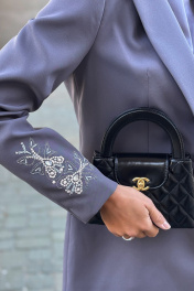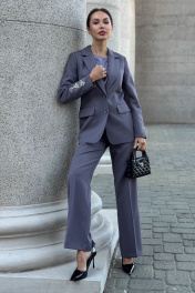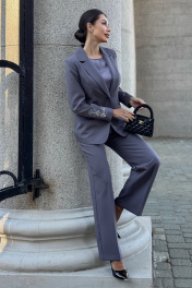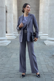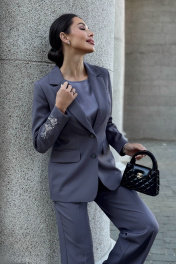 Этот изысканный брючный костюм – воплощение элегантности, загадочности и безупречного вкуса. Лаконичный силуэт, строгие линии и идеальная посадка подчёркивают утончённость образа. Особый акцент в костюме сделан на вышивке – изящный цветочный узор на поясе и манжетах жакета создаёт роскошный контраст, добавляя нотку утончённого блеска. Атласный топ с лёгким переливом гармонично дополняет образ, придавая ему мягкость и женственность. Костюм женский трёхпредметный состоит из удлиненного жакета полуприлегающего силуэта с вышивкой на рукаве, брюк и блузы. В комплект к брюкам идет съемный пояс с вышивкой расшитой декоративными камнями. Жакет женский из костюмно-плательной ткани, удлиненный, полуприлегающего силуэта, на подкладке, с центральной бортовой застежкой на 2 петли и пуговицы. По переду жакет с талиевой вытачкой, выходящей из горизонтального подреза расположенного чуть ниже линии талии, в котором обработан прорезной карман "в рамку" с клапаном. Один угол клапана - закругленный, другой заостренный - идет на продолжение бокового шва. В верхней части переда на левой половинке настрочена листочка, несет декоративную функцию. Спинка с рельефными швами, выходящими из проймы до низа и средним швом. Горловина обработана отложным воротником пиджачного типа. Углы лацкана заостренной формы. Линия борта внизу закругленная. Рукава втачные двухшовные, длинные, с декоративной вышивкой в нижней части. Внизу локтевой шов завершается маленькой шлицей. Жакет с плечевой накладкой. Брюки женские из костюмно-плательной ткани «со стрелками» прямые от колена, длинные с завышенной линией талии, без пояса, на обтачке. В верхней части передних половинок брюк застрочены 2 пары складок. Одна складка является продолжением «стрелки». На задних половинках брюк стачаны 2 пары талиевых вытачек. В боковых швах обработаны карманы с наклонной линией входа. В верхней части брюк по среднему и боковым швам настрочены шлевки для пояса. Верхний край брюк обработан обтачкой. Спереди обработана застежка на тесьму-молнию с гульфиком и откоском. В комплект к брюками идет съемный пояс, застегивающийся на 2 пришивных брючных крючка. Блуза женская из блузочной ткани со спущенной линией плеча, без рукавов, свободного кроя, полуприлегающего силуэта. Перед простой, спинка со средним швом, в верхней части обработан разрез, застегивающийся на 1 навесную петлю и пуговицу. Горловина окантована, по краю проложена отделочная строчка, ширина шва 0,6 см. По краю проймы и разрезу проложена отделочная строчка - 0,2 см. По низу блузки широкая подгибка. Внимание!!! размер и цвет фурнитуры может незначительно отличаться от фото. "44 размер ЖАКЕТ: длина жакета по среднему шву спинки – 69,0 см (±2,0 см), ширина жакета на уровне глубины проймы – 49,0 см (±1,0 см), ширина жакета на уровне линии талии – 42,0 см (±1,0 см), ширина жакета по низу – 52,0 см (±1,0 см), длина рукава жакета – 61,0 см (±1,0 см), ширина рукава жакета вверху – 17,0 см (±1,0 см), ширина рукава внизу - 12,0 см (±0,5 см), длина плеча жакета – 11,5 см (±0,5 см). БЛУЗА: длина блузы по середине спины – 65,5 см (±2,0 см), ширина блузы на уровне глубины проймы – 46,5 см (±1,0 см), ширина блузы на уровне линии талии – 44,0 см (±1,0 см), ширина блузы по низу – 49,5 см (±1,0 см), длина плеча блузы – 13,5 см (±0,5 см). БРЮКИ: длина брюк с поясом – 113,0 см (±2,0 см), ширина брюк на уровне линии талии – 35