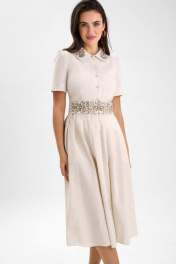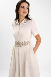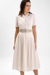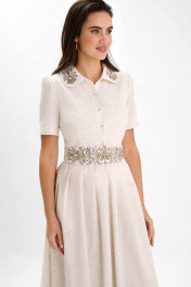 Платья с вышивкой – это всегда восхитительные и женственные образы, позволяющие выглядеть роскошно и привлекательно. Платье женское полуприлегающего силуэта из смесовой ткани со льном, отрезное по линии талии с притачным поясом и съемным поясом с художественной вышивкой, которая поддерживается на воротнике, длиной миди. Съемный пояс застегивается на 2 пришивных крючка. Платье на подкладке. Верхняя часть переда платья разрезная до линии талии с цельнокроенной планкой, которая застегивается на 5 петель и пуговиц (размер и цвет фурнитуры может незначительно отличаться от фото), с нагрудными вытачками, выходящими из бокового шва и талиевыми вытачками. Спинка со средним швом, в котором обработана на уровне линии талии застежка на потайную-тесьму и талиевыми вытачками. Горловина круглой формы обработана отложным воротником с закругленными концами и вышивкой. Рукава втачные одношовные, короткие с притачной манжетой и небольшой сборкой по окату. Нижняя часть платья прямая со складками. В боковых швах нижней части платья обработаны карманы в шве. По низу платья проложена отделочная строчка на 0,2 см от края. Данное изделие изготовлено из натуральной ткани в составе есть лен и вискоза, которым свойственна небольшая усадка после стирки. Параметры усадки учтены при конструировании изделия, поэтому рекомендуем перед использованием произвести предварительную стирку. "44 размер Длина платья по среднему шву спинки – 117,5 см (±1,5 см), Ширина на уровне глубины проймы – 47,0 см (±1,0 см), Ширина на уровне линии талии – 39,5 см (±1,0 см), Ширина на уровне линии бедра – 67,5 см (±1,0 см), Длина рукава с манжетой – 25,5 см (±1,0 см), Высота манжеты - 4,0 см, Ширина рукава вверху – 16,7 см (±1,0 см), Ширина рукава по манжете – 16,0 см (±1,0 см), Длина плеча – 11,7 см (±0,5 см). 46 размер Длина платья по среднему шву спинки – 117,5 см (±1,5 см), Ширина на уровне глубины проймы – 49,0 см (±1,0 см), Ширина на уровне линии талии – 41,5 см (±1,0 см), Ширина на уровне линии бедра – 69,5 см (±1,0 см), Длина рукава с манжетой – 25,5 см (±1,0 см), Высота манжеты - 4,0 см, Ширина рукава вверху – 17,7 см (±1,0 см), Ширина рукава по манжете – 17,0 см (±1,0 см), Длина плеча – 11,7 см (±0,5 см). 48 размер Длина платья по среднему шву спинки – 117,5 см (±1,5 см), Ширина на уровне глубины проймы – 51,0 см (±1,0 см), Ширина на уровне линии талии – 43,5 см (±1,0 см), Ширина на уровне линии бедра – 71,5 см (±1,0 см), Длина рукава с манжетой – 25,5 см (±1,0 см), Высота манжеты - 4,0 см, Ширина рукава вверху – 18,7 см (±1,0 см), Ширина рукава по манжете – 18,0 см (±1,0 см), Длина плеча – 11,7 см (±0,5 см). 50 размер Длина платья по среднему шву спинки – 117,5 см (±1,5 см), Ширина на уровне глубины проймы – 52,0 см (±1,0 см), Ширина на уровне линии талии – 45,5 см (±1,0 см), Ширина на уровне линии бедра – 73,5 см (±1,0 см), Длина рукава с манжетой – 26,5 см (±1,0 см), Высота манжеты - 4,0 см, Ширина рукава вверху – 19,0 см (±1,0 см), Ширина рукава по манжете – 18,2 см (±1,0 см), Длина плеча – 12,5 см (±0,5 см). 52 размер Длина платья по среднему шву спинки – 117,5 см (±1,5 см), Ширина на уровне глубины проймы – 54,0 см (±1,0 см), Ширина на уровне линии талии – 47,5 см (±1,0 см), Ширина на уровне линии бедра – 75,5 см (±1,0 см), Длина рукава с манжетой – 26,5 см (±1,0 см), Высота манжеты - 4,0 см, Ширина рукава вверху – 20,0 см (±1,0 см), Ширина рукава по манжете – 19,2 см (±1,0 см), Длина плеча – 12,5 см (±0,5 см). 54 размер Длина платья по среднему шву спинки – 117,5 см (±1,5 см), Ширина на уровне глуби