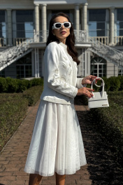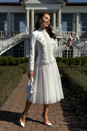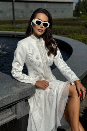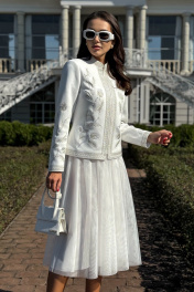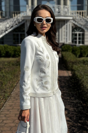 Жакет, украшенный вышивкой, приобретают некую уникальность. Растительные узоры эффектно дополняют благородную ткань. Благодаря вышивке жакет становятся более женственным и изысканным. Жакет женский из мягкой искусственной замши на трикотажной основе полуприлегающего силуэта с художественной вышивкой, на подкладке, однобортный, с центральной застежкой до верха на молнии. На полочке нагрудная вытачка, выходящая из бокового шва (и талиевая вытачка, отнесенная к боковому шву в 44-48 размерах). Полочка с вышивкой заполняющей практически всю центральную часть жакета. Край борта и низ переда жакета оформлены вышитой каймой с орнаментом, повторяющимся по воротнику и низу рукава. Спинка со средним швом и рельефами, выходящими из проймы. Рукава втачные двухшовные с вышивкой в нижней части, длинные. Горловина обработана воротником-стойкой с вышивкой. Этот жакет прекрасно сочетается с платьем 22-978-1, 22-978-6 и 22-978-3. Средняя длина жакета по среднему шву - 53,0 см (±3,0 см), Длина рукава жакета - 60,0 см (±1,5 см). Состав изделия: полиэстер - 75%, вискоза - 21%, спандекс - 4% "44:длина жакета по среднему шву спинки – 53,5 см (±2,0 см), ширина на уровне проймы – 47,0 см (±1,0 см), ширина на уровне линии талии – 39,5 см (±1,0 см), ширина жакета по низу – 48,0 см (±1,0 см), длина рукава жакета – 60,5 см (±1,0 см), ширина рукава жакета вверху – 17,5 см (±1,0 см), ширина рукава внизу – 12,0 см (±0,5 см), длина плеча жакета – 12,0 см (±0,5 см). 46:длина жакета по среднему шву спинки – 54,5 см (±2,0 см), ширина на уровне проймы – 49,0 см (±1,0 см), ширина на уровне линии талии – 41,5 см (±1,0 см), ширина жакета по низу – 50,0 см (±1,0 см), длина рукава жакета – 60,5 см (±1,0 см), ширина рукава жакета вверху – 18,0 см (±1,0 см), ширина рукава внизу – 12,5 см (±0,5 см), длина плеча жакета – 12,5 см (±0,5 см). 48:Длина жакета по среднему шву спинки – 54,5 см (±2,0 см), ширина на уровне проймы – 51,0 см (±1,0 см), ширина на уровне линии талии – 43,5 см (±1,0 см), ширина жакета по низу – 52,0 см (±1,0 см), длина рукава жакета – 60,5 см (±1,0 см), ширина рукава жакета вверху – 19,0 см (±1,0 см), ширина рукава внизу – 12,5 см (±0,5 см), длина плеча жакета – 12,5 см (±0,5 см). 50:Длина жакета по среднему шву спинки – 55,5 см (±2,0 см), ширина на уровне проймы – 52,0 см (±1,0 см), ширина на уровне линии талии – 45,5 см (±1,0 см), ширина жакета по низу – 54,0 см (±1,0 см), длина рукава жакета – 60,5 см (±1,0 см), ширина рукава жакета вверху – 19,2 см (±1,0 см), ширина рукава внизу – 12,5 см (±0,5 см), длина плеча жакета – 12,8 см (±0,5 см). 52:Длина жакета по среднему шву спинки – 55,5 см (±2,0 см), ширина на уровне проймы – 54,0 см (±1,0 см), ширина на уровне линии талии – 47,5 см (±1,0 см), ширина жакета по низу – 56,0 см (±1,0 см), длина рукава жакета – 61,5 см (±1,0 см), ширина рукава жакета вверху – 20,2 см (±1,0 см), ширина рукава внизу – 12,5 см (±0,5 см), длина плеча жакета – 12,8 см (±0,5 см). 54:длина жакета по среднему шву спинки – 55,5 см (±2,0 см), Ширина на уровне проймы – 56,0 см (±1,0 см), Ширина на уровне линии талии – 51,0 см (±1,0 см), Ширина жакета по низу – 59,0 см (±1,0 см), Длина рукава жакета – 61,5 см (±1,0 см), Ширина рукава жакета вверху – 21,2 см (±1,0 см), Ширина рукава внизу – 12,5 см (±0,5 см), Длина плеча жакета – 12,8 см (±0,5 см). 56:длина жакета по среднему шву спинки – 55,5 см (±2,0 см), Ширина на уровне проймы – 61,0 см (±1,0 см), Ширина на уровне линии талии – 57,0 см (±1,0 см), Ширина жакета по низу – 63,0 см (±1,0 см), Длина рукава жакета – 60,0 см (±1,0 см), Ширина рукава жакета вверху – 21,5 см (±1,0 см), Ширина рукава внизу – 13,5 см (±0,5 