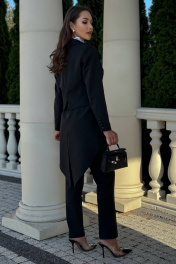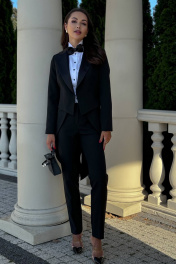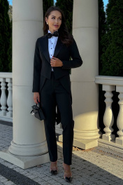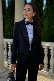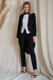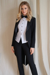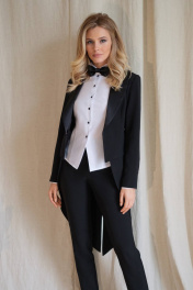 Женский фрак – эталон отличного вкуса и уникального стиля. Такой костюм предназначен для настоящей женщины с тонким вкусом, развитой индивидуальностью и уникальным чувством стиля. Костюм женский трёхпредметный, состоящий из фрака, блузы и брюк. В комплекте к костюму идёт галстук-бабочка. Фрак представляет собой укороченный жакет прилегающего силуэта, на подкладке с отстёгивающимися удлинёнными сзади полами (фалдами), спускающимися до линии колена. Полы крепятся на 8 петель и пуговиц, со средним швом, который заканчивается длинным разрезом. Жакет женский с центральной бортовой застёжкой на крючок. Перед жакета с нагрудными вытачками идущими до низа. По низу центральная часть переда выполнена углом. Спинка жакета с рельефными швами, выходящими из проймы и идущими до низа, и средним швом, который завершается разрезом. По низу центральная часть спинки выполнена углом. Горловина жакета обработана отложным воротником пиджачного типа. Лацканы и воротник выполнены из атласной ткани. Рукава втачные двухшовные, длинные. Локтевой шов завершается шлицей, застёгивающейся на 4 петли и пуговицы (пуговицы могут незначительно отличаться от фото) Блуза женская полуприлегающего силуэта с центральной бортовой застёжкой на 6 петель и пуговиц. И ещё 1 петля и пуговица имеется на стойке-воротнике. Перед блузы с талиевыми вытачками идущими до низа. По низу центральная часть переда выполнена углом. Спина блузы со средним швом и талиевыми вытачками. Горловина круглой формы обработана воротником- стойкой с загнутыми углами. Рукава втачные одношовные, длинные, с притачной широкой манжетой по низу рукава. Манжета застегивается на 2-е петли и пуговицы. На рукаве по шву притачивания манжеты заложены складки. Брюки женские прямые. На задних половинках брюк обработаны талиевые вытачки. На передних полотнищах брюк в шве притачивания пояса обработаны карманы с листочкой. Верхний край брюк обработан притачным узким поясом-обтачкой. Брюки застёгиваются спереди на тесьму-молнию и брючный крючок на поясе брюк. ЖАКЕТ, БРЮКИ: костюмно-плательная БЛУЗКА: рубашечная ЖАКЕТ, БРЮКИ: полиэстер 62%, вискоза – 34%, спандекс – 4% БЛУЗА: хлопок 76%, полиэстер 22%, эластан 2%