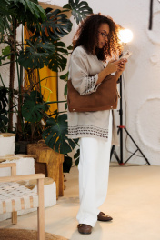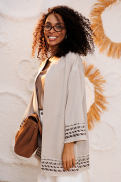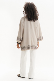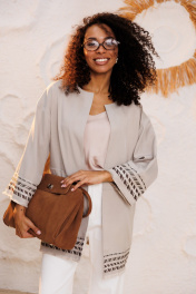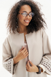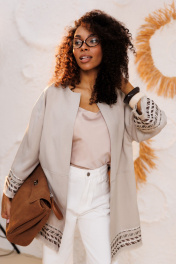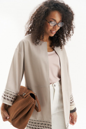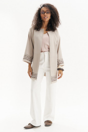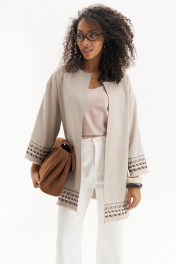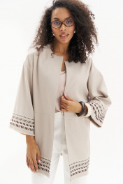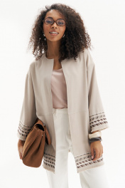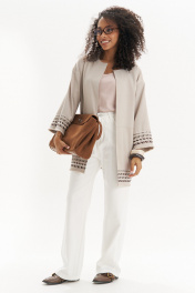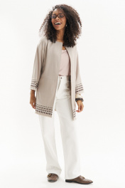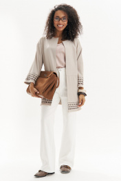 Этот кардиган — воплощение комфорта и стиля, идеально подходящее для создания расслабленного, но эффектного образа! Кардиган женский прямого силуэта без подкладки с декоративной вышивкой, без застежки. Кардиган отлично подойдет для ежедневной носки в весенне-летний период. Полочки кардигана с горизонтальными подрезами на уровне линии талии. Спинка со средним швом. Горловина круглой формы, обтачная. Рукава втачные одношовные со спущенной линией проймы, длиной 3/4. Низ изделия и низ рукавов с бахромой и вышивкой. По проймам, среднему шву спинки, подрезам переда, горловине и краям борта расположена отделочная строчка шириной 0,5. "46 размер Длина спинки по среднему шву с бахромой - 73,0 см (±2,0 см), Ширина на уровне глубины проймы - 53,0 см (±1,0 см), Ширина на уровне линии талии - 53,0 см (±1,0 см), Ширина на уровне линии бедер - 55,5 см (±1,0 см), Длина рукава с бахромой - 40,5 см (±2,0 см), Ширина рукава вверху - 21,5 см (±1,0 см), Ширина рукава по низу - 19,5 см (±0,5 см), Длина плеча - 19,2 см (±0,5 см). 48 размер Длина спинки по среднему шву с бахромой - 73,0 см (±2,0 см), Ширина на уровне глубины проймы - 55,0 см (±1,0 см), Ширина на уровне линии талии - 55,0 см (±1,0 см), Ширина на уровне линии бедер - 57,5 см (±1,0 см), Длина рукава с бахромой - 40,5 см (±2,0 см), Ширина рукава вверху - 22,5 см (±1,0 см), Ширина рукава по низу - 20,5 см (±0,5 см), Длина плеча - 19,2 см (±0,5 см). 50 размер Длина спинки по среднему шву с бахромой - 75,0 см (±2,0 см), Ширина на уровне глубины проймы - 57,5 см (±1,0 см), Ширина на уровне линии талии - 57,5 см (±1,0 см), Ширина на уровне линии бедер - 59,5 см (±1,0 см), Длина рукава с бахромой - 40,5 см (±2,0 см), Ширина рукава вверху - 22,5 см (±1,0 см), Ширина рукава по низу - 20,5 см (±0,5 см), Длина плеча - 19,5 см (±0,5 см). 52 размер Длина спинки по среднему шву с бахромой - 75,0 см (±2,0 см), Ширина на уровне глубины проймы - 59,5 см (±1,0 см), Ширина на уровне линии талии - 59,5 см (±1,0 см), Ширина на уровне линии бедер - 62,5 см (±1,0 см), Длина рукава с бахромой - 40,5 см (±2,0 см), Ширина рукава вверху - 23,5 см (±1,0 см), Ширина рукава по низу - 21,5 см (±0,5 см), Длина плеча - 19,5 см (±0,5 см). 54 размер Длина спинки по среднему шву с бахромой - 75,0 см (±2,0 см), Ширина на уровне глубины проймы - 61,0 см (±1,0 см), Ширина на уровне линии талии - 61,0 см (±1,0 см), Ширина на уровне линии бедер - 64,0см (±1,0 см), Длина рукава с бахромой - 40,5 см (±2,0 см), Ширина рукава вверху - 24,5 см (±1,0 см), Ширина рукава по низу - 21,5 см (±0,5 см), Длина плеча - 20,3 см (±0,5 см). 56 размер Длина спинки по среднему шву с бахромой - 75,0 см (±2,0 см), Ширина на уровне глубины проймы - 63,0 см (±1,0 см), Ширина на уровне линии талии - 63,0 см (±1,0 см), Ширина на уровне линии бедер - 66,0см (±1,0 см), Длина рукава с бахромой - 40,5 см (±2,0 см), Ширина рукава вверху - 25,5 см (±1,0 см), Ширина рукава по низу - 22,5 см (±0,5 см), Длина плеча - 20,3 см (±0,5 см). "