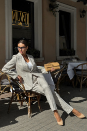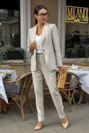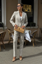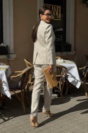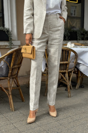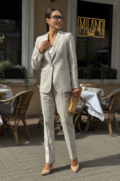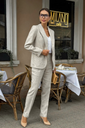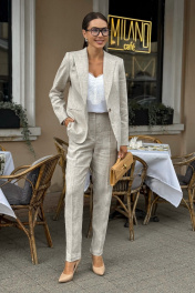Льняной костюм женский брючный URS - тот самый вариант, который выглядит собранно, но ощущается свободно. Светлый бежевый оттенок освежает образ, а натуральная фактура льна сразу задаёт спокойную «дорогую» эстетику. В основе - льняная ткань из белорусского льна, и это чистый 100% лен, который ценят за комфорт в движении и аккуратный вид. Костюм женский ЮРС, двух предметный состоит из жакета и брюк, выполненных из костюмно- плательной ткани лен. Жакет полуприлегающего силуэта, на х\б подкладке, с центральной бортовой застежкой на 1 петлю и 1 пуговицу. Борта расходятся к низу А-образно и имеют закругленную форму. Перед с нагрудными вытачками, идущими от карманов вверх, с отрезными бочками. В нижней части переда обработаны прорезные карманы «в рамку». Спинка со средним швом, в нижней части которого расположена шлица. Рукава втачные, двухшовные, длинные. Локтевой шов по низу с отлетной шлицей, застегивающейся на 1 петлю и 1 пуговицу. Горловина оформлена воротником пиджачного типа. Концы лацкана и воротника имеют закругленную форму. Жакет с плечевыми накладками. Брюки женские, зауженные к низу, на поясе, с 4-мя шлевками, с застежкой на тесьму - «молнию», расположенную в среднем шве передних половинок Пояс застегивается спереди на один пришивной крючок, 1 петлю и 1 потайную пуговицу. Передние половинки брюк с боковыми наклонными карманами. Задние половинки брюк с вытачками, идущими от пояса вниз, с прорезным карманом с листочкой на левой задней части. Передние и задние половинки брюк с заутюженными стрелками. В размерах 50,52,54,56 пояс с резинками от кармана передней половинки до вытачки задней половинки.