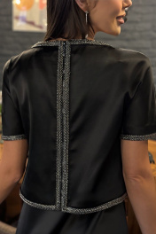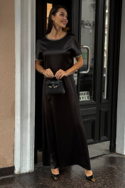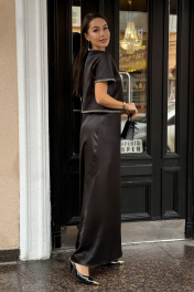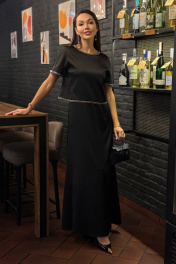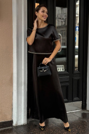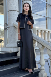 Нарядный женский костюм с платьем от брендов URS — это утончённый праздничный комплект, созданный для тех, кто выбирает изысканность, благородство и проверенную временем классику. Такой вечерний костюм прекрасно вписывается в атмосферу торжества, подчеркивает женственность и обеспечивает комфорт на протяжении всего события. Костюм женский, состоящий из блузона и платья, выполненных из плательной атласной ткани, нарядный. Блузон прямого силуэта, укороченный, с цельнокроеными короткими рукавами, с застежкой по спинке до верха на разъёмную тесьму-молнию с металлическими звеньями. Блузон также можно одевать застежкой на перед. Перед и спинка с цельнокроеным бочком. Рукава цельнокроеные короткие, с притачной нижней частью. Горловина блузона - круглая лодочка, застегивающаяся по спинке на пришивной потайной крючок. Низ переда, спинки и рукавов, горловина, застежка спинки вдоль молнии декорированы отделочной тесьмой из сетки с нашивными бусинами (размер и цвет фурнитуры может незначительно отличаться от фото). Перед, спинка и рукава на подкладке. Платье полуприлегающего силуэта, на бретелях, слегка расклешенное к низу, длинное, на отлетной по низу подкладке. Перед с нагрудными вытачками, выходящими из боковых швов. Верхняя часть переда ˅- образная, углубленная.
