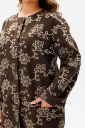 Удлиненный жакет— один из самых популярных предметов женского гардероба. Он необыкновенно универсален. Одно из важных достоинство удлиненного жакета — это то, что он вытягивает фигуру и стройнит любой силуэт. Жакет женский, прямого силуэта, со спущенной линией плеча, с центральной бортовой застежкой на 4 пришивные кнопки, (размер, форма и цвет фурнитуры могут незначительно отличаться), для повседневной носки. Жакет выполнен из костюмной ткани на подкладке. Перед с нагрудными вытачками, идущими из пройм и с тремя горизонтальными швами. Верхние и средние горизонтальные швы, каждый с двумя отделочными строчками шириной по 0,2 см, в нижних швах обработаны карманы, застегивающиеся на потайную тесьму - ""молнию"". Спинка со средним швом и двумя вытачками, идущими от горловины вниз. Горловина переда и спинки обтачная, округлой формы, по переду углубленная. Рукава втачные, со спущенной линией проймы, длинные, по низу с притачными манжетами. Швы притачивания манжеты с двумя отделочными строчками по 0,2 см. Средняя длина по среднему шву спинки 80,5 см (±3,0 см); Средняя длина рукава от горловины до низа с манжетой 75,0 см (±1,5 см). Состав: полиэстер - 73%, вискоза - 25%, спандекс - 2% Цвет - темно-оливковый "50 размер Длина жакета по среднему шву спинки - 80,5 см (±2,0 см), Ширина на уровне глубины проймы - 56,5 см (±1,0 см), Ширина на уровне линии талии - 55,5 см (±1,0 см), Ширина на уровне линии бедер - 60,5 см (±1,0 см), Длина плеча (спущенного) - 19,5 см (±0,5 см). Длина рукава с манжетой - 53,5 см (±1,0 см), Ширина рукава вверху - 20,5 см (±1,0 см), Ширина рукава внизу - 17,0 см (±0,5 см) 52 размер Длина жакета по среднему шву спинки - 80,5 см (±2,0 см), Ширина на уровне глубины проймы - 58,5 см (±1,0 см), Ширина на уровне линии талии - 57,5 см (±1,0 см), Ширина на уровне линии бедер - 62,5 см (±1,0 см), Длина плеча (спущенного) - 19,5 см (±0,5 см). Длина рукава с манжетой - 53,5 см (±1,0 см), Ширина рукава вверху - 21,5 см (±1,0 см), Ширина рукава внизу - 17,0 см (±0,5 см) 54 размер Длина жакета по среднему шву спинки - 80,5 см (±2,0 см), Ширина на уровне глубины проймы - 60,5 см (±1,0 см), Ширина на уровне линии талии - 59,5 см (±1,0 см), Ширина на уровне линии бедер - 64,5см (±1,0 см), Длина плеча (спущенного) - 19,5 см (±0,5 см). Длина рукава с манжетой - 53,5 см (±1,0 см), Ширина рукава вверху - 22,5 см (±1,0 см), Ширина рукава внизу - 17,0 см (±0,5 см) 56 размер Длина жакета по среднему шву спинки - 81,5 см (±2,0 см), Ширина на уровне глубины проймы - 63,0 см (±1,0 см), Ширина на уровне линии талии - 63,0 см (±1,0 см), Ширина на уровне линии бедер - 67,0 см (±1,0 см), Длина плеча (спущенного) - 21,5 см (±0,5 см). Длина рукава с манжетой - 53,5 см (±1,0 см), Ширина рукава вверху - 23,0 см (±1,0 см), Ширина рукава внизу - 18,5 см (±0,5 см) 58 размер Длина жакета по среднему шву спинки - 81,5 см (±2,0 см), Ширина на уровне глубины проймы - 65,0 см (±1,0 см), Ширина на уровне линии талии - 65,0 см (±1,0 см), Ширина на уровне линии бедер - 69,0 см (±1,0 см), Длина плеча (спущенного) - 21,0 см (±0,5 см). Длина рукава с манжетой - 53,5 см (±1,0 см), Ширина рукава вверху - 24,0 см (±1,0 см), Ширина рукава внизу - 18,5см (±0,5 см) 60 размер Длина жакета по среднему шву спинки - 81,5 см (±2,0 см), Ширина на уровне глубины проймы - 67,0 см (±1,0 см), Ширина на уровне линии талии - 67,0 см (±1,0 см), Ширина на уровне линии бедер - 71,0 см (±1,0 см), Длина плеча (спущенного) - 21,0 см (±0,5 см). Длина рукава с манжетой - 53,5 см (±1,0 см), Ширина рукава вверху - 25,0 см (±1,0 см), Ширина рукава внизу - 18,5см (±0,5 см) 62 размер Длина жакета по среднему шву спинки - 82,0 см (±2,0 см),