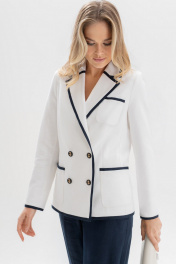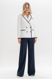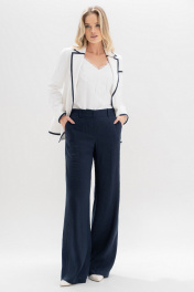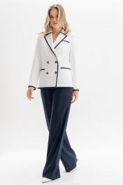 Этот костюм изо льна — воплощение утончённости и сдержанного шика. Двубортный жакет с акцентной тёмно-синей окантовкой подчёркивает силуэт и добавляет графичности образу. Золотые пуговицы с якорями придают ансамблю характерный морской шарм, создавая отсылку к стилю яхт-клубов и Средиземноморскому лету.⠀Этот костюм гармонично сочетает классику и современность, подойдёт как для деловых встреч, так и для стильных выходов на отдыхе у моря. Костюм женский 2-х предметный, состоящий из жакета и брюк, выполненных из костюмно-плательной ткани лен, для повседневной носки. Жакет женский, полуприлегающего силуэта, выполнен из молочного льна, на подкладке, с двубортной застежкой на 2 петли, 4 декоративные (размер и цвет фурнитуры может незначительно отличаться от фото). Перед и спинка с цельнокроеным отрезным бочком. Перед с нагрудными вытачками, переходящими в подрезы от рельефных швов бочка, в левой верхней и в нижних частях с накладными карманами с закругленными углами. Спинка со средним швом, с рельефными швами бочка, идущими от пройм до низа. Горловина оформлена воротником пиджачного типа. Рукава втачные, двухшовные, длинные. Воротник, лацканы, борта, верх карманов, низа рукавов, низа переда и спинки обработаны притачными планками выполненными из темно-синего льна. Жакет с плечевыми накладками. Брюки женские, в размерах 46,48,50 прямые от бедра, на обтачном поясе, с 5-ю шлевками, с застежкой на тесьму - «молнию», расположенную в среднем шве передних половинок. Пояс застегивается спереди на 1 пришивной потайной крючок, 1 петлю и 1 потайную пуговицу. Передние половинки брюк, с боковыми наклонными карманами. Задние половинки брюк с талиевыми вытачками. Брюки женские, в размерах 52,54,56 прямые от бедра, с притачным поясом, с резинками на уровне боковых швов, с 5-ю шлевками, с застежкой на тесьму - «молнию», расположенную в среднем шве передних половинок. Пояс застегивается спереди на 1 пришивной потайной крючок, 1 петлю и 1 потайную пуговицу. Передние половинки брюк, с боковыми наклонными карманами. Задние половинки брюк с талиевыми вытачками. "46 размер Жакет Длина по среднему шву спинки - 65,0 см (±2,0 см), Ширина на уровне глубины проймы - 52,0 см (±1,0 см), Ширина на уровне линии талии - 49,0 см (±1,0 см), Ширина на уровне линии бедер - 56,0 см (±1,0 см), Длина рукава - 62,0 см (±1,0 см), Ширина рукава вверху - 17,5 см (±1,0 см), Ширина рукава по низу - 12,7 см (±0,5 см), Длина плеча - 11,8 см. Брюки Длина брюк по боковому шву с поясом - 111,5 см (±2,0 см), Ширина на уровне линии талии - 40,0 см (±1,0 см), Ширина на уровне линии бедер - 52,0 см (±1,0 см), Ширина брюк по низу - 32,4 см (±0,5 см), Ширина пояса - 5,0 см. 48 размер Жакет Длина по среднему шву спинки - 65,0 см (±2,0 см), Ширина на уровне глубины проймы - 54,0 см (±1,0 см), Ширина на уровне линии талии - 51,0 см (±1,0 см), Ширина на уровне линии бедер - 58,0 см (±1,0 см), Длина рукава - 62,0 см (±1,0 см), Ширина рукава вверху - 18,5 см (±1,0 см), Ширина рукава по низу - 13,1 см (±0,5 см), Длина плеча - 11,8 см. Брюки Длина брюк по боковому шву с поясом - 111,5 см (±2,0 см), Ширина на уровне линии талии - 42,0 см (±1,0 см), Ширина на уровне линии бедер - 54,0 см (±1,0 см), Ширина брюк по низу - 32,7 см (±0,5 см), Ширина пояса - 5,0 см. 50 размер Жакет Длина по среднему шву спинки - 65,0 см (±2,0 см), Ширина на уровне глубины проймы - 56,0 см (±1,0 см), Ширина на уровне линии талии - 53,0 см (±1,0 см), Ширина на уровне линии бедер - 60,0 см (±1,0 см), Длина рукава - 62,0 см (±1,0 см)
