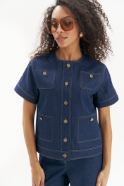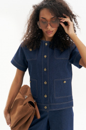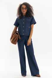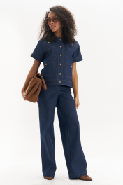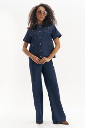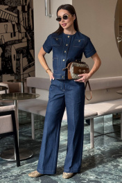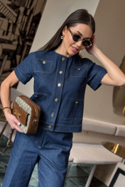 Современная интерпретация классического денима — идеальный выбор для современной женщины, которая ценит комфорт, стиль и характер. Укороченный жакет с короткими рукавами и выразительной контрастной строчкой дополнен золотистыми пуговицами, создающими винтажное настроение. Прямые брюки с высокой посадкой визуально вытягивают силуэт и придают образу уверенность. * Универсальный тёмно-синий деним — база для стильных сочетаний. * Гармонично смотрится с аксессуарами в натуральной гамме. * Прекрасно подойдёт как для будней в городе, так и для выходных с настроением casual chic. Этот костюм — настоящий statement для тех, кто не боится быть собой. Костюм женский, двух предметный состоит из блузки и брюк, выполненных из джинсовой ткани с декоративными контрастными отделочными строчками, для повседневной носки. Блузка прямого силуэта, с центральной бортовой застежкой до верха с притачными планками, застегивающимися на 5 петель и 5 пуговиц (размер и цвет фурнитуры может незначительно отличаться от фото). Перед в верхней и нижней частях с имитацией накладных карманов с закругленными углами. На каждом кармане пришито по 1 пуговице. Спинка со средним швом. Низ переда и спинки с притачной планкой, застегивающейся на переде на 1 петлю и 1 пуговицу. Горловина круглая обтачная косой бейкой. Рукава одношовные, короткие с притачными манжетами. Брюки женские, прямые, на обтачном поясе, с 5-ю шлевками, с застежкой на тесьму - «молния», расположенной в среднем шве передних половинок. Пояс застегивается спереди на 1 петлю и 1 пуговицу. Передние половинки брюк с боковыми наклонными карманами. Задние половинки брюк с талиевыми вытачками, идущими от пояса вниз. Состав ткани хлопок 100% Тип ткани джинсовая ткань Блузка Длина спинки по среднему шву - 53,5 см (±2,0 см), Ширина на уровне глубины проймы - 46,5 см (±1,0 см), Ширина на уровне линии талии - 47,5 см (±1,0 см), Ширина по низу - 48,5 см (±1,0 см), Длина рукава - 20,5 см (±1,0 см), Ширина рукава вверху - 18,0 см (±1,0 см), Длина плеча - 13,2 см (±0,5 см). Брюки Длина брюк по боковому шву с поясом - 114,2 см (±2,0 см), Ширина на уровня линии талии - 35,5 см (±1,0 см), Ширина на уровне линии бедер - 48,0 см (±1,0 см), Ширина брюк по низу - 28,0 см (±0,5 см), Ширина пояса - 4,2 см. 44 размер Блузка Длина спинки по среднему шву - 53,5 см (±2,0 см), Ширина на уровне глубины проймы - 48,5 см (±1,0 см), Ширина на уровне линии талии - 49,5 см (±1,0 см), Ширина по низу - 50,5 см (±1,0 см), Длина рукава - 20,5 см (±1,0 см), Ширина рукава вверху - 19,0 см (±1,0 см), Длина плеча - 13,2 см (±0,5 см). Брюки Длина брюк по боковому шву с поясом - 114,2 см (±2,0 см), Ширина на уровня линии талии - 37,5 см (±1,0 см), Ширина на уровне линии бедер - 50,0 см (±1,0 см), Ширина брюк по низу - 29,0 см (±0,5 см), Ширина пояса - 4,2 см. 46 размер Блузка Длина спинки по среднему шву - 55,0 см (±2,0 см), Ширина на уровне глубины проймы - 50,5 см (±1,0 см), Ширина на уровне линии талии - 52,0 см (±1,0 см), Ширина по низу - 52,5 см (±1,0 см), Длина рукава - 21,0 см (±1,0 см), Ширина рукава вверху - 19,5 см (±1,0 см), Длина плеча - 13,4 см (±0,5 см). Брюки Длина брюк по боковому шву с поясом - 114,7 см (±2,0 см), Ширина на уровня линии талии - 40,0 см (±1,0 см), Ширина на уровне линии бедер - 52,0 см (±1,0 см), Ширина брюк по низу - 29,0 см (±0,5 см), Ширина пояса - 4,2 см. 48 размер Блузка Длина спинки по среднему шву - 55,0 см (±2,0 см), Ширина на уровне глубины проймы - 52,5 см (±1,0 см), Ширина на уровне линии талии - 54,0 см (±1,0 см), Ширина по низу - 54,5 см (±1,0 см), Длина рукава - 21,0 см (