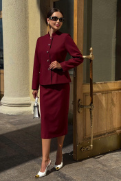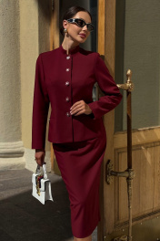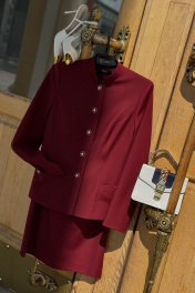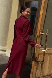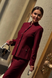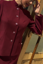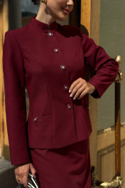 Женский костюм с юбкой бордового цвета от бренда URS – это воплощение элегантности, строгости и изысканности. Такой комплект создан для женщин, которые ценят деловой стиль, предпочитают классику и хотят оставаться безупречными в любой ситуации – будь то офис, деловые переговоры, официальные встречи или торжественные мероприятия. Костюм женский, состоящий из жакета и юбки, выполненный из костюмной ткани, предназначен для повседневной носки. Жакет женский полуприлегающего силуэта, на подкладке, с центральной бортовой застежкой до верха на 5 петель и 5 пуговиц (размер и цвет фурнитуры может незначительно отличаться от фото). Перед с рельефными швами. Бочки в нижних частях с горизонтальными подрезами, в которых расположены функциональные карманы с листочками, застегивающимися на 1 петлю и пуговицу. Спинка со средним и с рельефными швами. Рукава втачные, двухшовные, длинные. Горловина оформлена воротником – стойкой. Жакет с плечевыми накладками. Юбка прямого силуэта, зауженная к низу, на притачном поясе, застегивающимся на 1 петлю и пуговицу. Переднее и заднее полотнища с талиевыми вытачками. Заднее полотнище со средним швом, в верхней части которого обработана застежка на потайную тесьму - молнию, в нижней – шлица. Юбка на отлетной по низу подкладке. В размерах 50,52,54 в поясе, на уровне боковых швов предусмотрена резинка для лучшего прилегания по талии. "44 размер Жакет Длина жакета по среднему шву спинки – 61,0см (±2,0 см), Ширина на уровне глубины проймы – 48,0 см (±1,0 см), Ширина на уровне линии талии – 43,5см (±1,0 см), Ширина на уровне линии бедер – 52,0 см (±1,0 см), Длина рукава – 61,0 см (±1,0 см), Ширина рукава вверху – 17,5 см (±1,0 см), Ширина рукава внизу - 12,5 см (±0,5 см), Длина плеча – 11,8см (±0,5 см). Юбка Длина по боковому шву с поясом – 79,0 см (±3,0 см), Ширина на уровне линии талии – 37,0 см (±1,0 см), Ширина на уровне линии бедер – 48,5 см (±1,0 см), Ширина по низу – 45,0 см (±1,0см). Высота пояса – 3,5см (±0,5см). 46 размер Жакет Длина жакета по среднему шву спинки – 61,0см (±2,0 см), Ширина на уровне глубины проймы – 50,0 см (±1,0 см), Ширина на уровне линии талии – 44,5см (±1,0 см), Ширина на уровне линии бедер – 54,0 см (±1,0 см), Длина рукава – 61,0 см (±1,0 см), Ширина рукава вверху – 18,5 см (±1,0 см), Ширина рукава внизу - 13,0 см (±0,5 см), Длина плеча – 11,8см (±0,5 см). Юбка Длина по боковому шву с поясом – 79,0 см (±3,0 см), Ширина на уровне линии талии – 39,0 см (±1,0 см), Ширина на уровне линии бедер – 50,5 см (±1,0 см), Ширина по низу – 47,0 см (±1,0см). Высота пояса – 3,5см (±0,5см). 48 размер Жакет Длина жакета по среднему шву спинки – 61,0см (±2,0 см), Ширина на уровне глубины проймы – 52,0 см (±1,0 см), Ширина на уровне линии талии – 47,5см (±1,0 см), Ширина на уровне линии бедер – 56,0 см (±1,0 см), Длина рукава – 61,0 см (±1,0 см), Ширина рукава вверху – 19,5 см (±1,0 см), Ширина рукава внизу - 13,5 см (±0,5 см), Длина плеча – 12,0см (±0,5 см). Юбка Длина по боковому шву с поясом – 79,0 см (±3,0 см), Ширина на уровне линии талии – 40,5 см (±1,0 см), Ширина на уровне линии бедер – 53,0 см (±1,0 см), Ширина по низу – 49,0 см (±1,0см). Высота пояса – 3,5см (±0,5см). 50 размер Жакет Длина жакета по среднему шву спинки – 62,5см (±2,0 см), Ширина на уровне глубины проймы – 54,0 см (±1,0 см), Ширина на уровне линии талии – 50,0см (±1,0 см), Ширина на уровне линии бедер – 58,0 см (±1,0 см), Длина рукава – 61,0 см (±1,0 см), Ширина рукава вверху – 20,0 см (±1,0 см), Ширина рукава внизу - 13,5 см (±0,5 см), Длина плеча – 12,0см (±0,5 см). Юбка Длина по 