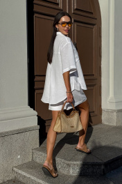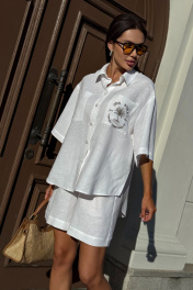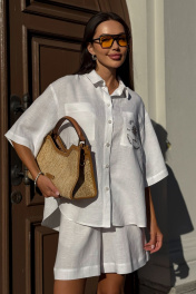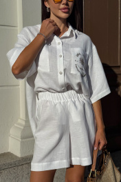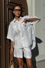 Белый костюм летний женский с шортами URS - тот самый комплект, который выручает в жару, в дороге и на отдыхе. Это костюм шорты и рубашка женский летний, где все уже собрано в готовый образ: надели и пошли - в город, на море или в путешествие. Костюм женский ЮРС, двух предметный состоящий из блузки и шорт, выполнен из костюмно-плательной льняной ткани. Блузка женская свободного силуэта, со спущенной линией плеча, с центральной бортовой застежкой на 6 петель и пуговиц (размер и цвет фурнитуры может незначительно отличаться от фото). Перед в верхней части с прямоугольными накладными карманами. Левый карман с вышивкой. Низ переда короче низа спинки на 9,0см. Спинка с притачной кокеткой и встречной складкой, выходящей из-под кокетки. Блузка с разрезами в боковых швах, с фигурным низом.Рукава втачные, рубашечные, короткие. Горловина оформлена стояче-отложным воротником с отрезной стойкой, застегивающейся на 1 петлю и пуговицу. Шорты женские, слегка расклешенные к низу, на притачном поясе, с резинкой вдоль всего пояса. Передние половинки с боковыми наклонными карманами. " 46 размер Блузка Длина блузки по середине спинки –73,5 см (±2,0 см), Ширина спинки 48,0 см (±0,5 см), Ширина на уровне глубины проймы – 65,0 см (±1,0 см), Ширина на уровне линии талии – 66,0см (±1,0 см), Ширина на уровне линии низа – 68,0 см (±1,0 см), Длина плеча спущенного – 18,0 см (±0,5 см). Длина рукава – 28,0 см (±1,0 см), Длина от горловины по плечу до низа рукава – 46,0 см (±1,0 см), Шорты Длина по боковому шву с поясом – 47,0см (±2,0 см), Ширина пояса - 4,0см (±0,5 см), Ширина на уровне линии талии ( резинка не растянута) – 32,0см (±1,0 см), Ширина на уровне линии талии ( с растянутой резинкой) – 48,0см (±1,0 см), Ширина на уровне линии бедер – 57,0см (±1,0 см), Ширина по низу – 39,0см (±0,5 см). 48 размер Блузка Длина блузки по середине спинки –73,5 см (±2,0 см), Ширина спинки 49,0 см (±0,5 см), Ширина на уровне глубины проймы – 67,0 см (±1,0 см), Ширина на уровне линии талии – 67,0см (±1,0 см), Ширина на уровне линии низа – 71,0 см (±1,0 см), Длина плеча спущенного – 18,0 см (±0,5 см). Длина рукава – 28,0 см (±1,0 см), Длина от горловины по плечу до низа рукава – 46,0 см (±1,0 см), Шорты Длина по боковому шву с поясом – 48,0см (±2,0 см), Ширина пояса - 4,0см (±0,5 см), Ширина на уровне линии талии ( резинка не растянута) – 34,0см (±1,0 см), Ширина на уровне линии талии ( с растянутой резинкой) – 50,0см (±1,0 см), Ширина на уровне линии бедер – 59,0см (±1,0 см), Ширина по низу – 41,0см (±0,5 см). 50 размер Блузка Длина блузки по середине спинки –73,5 см (±2,0 см), Ширина спинки 50,0 см (±0,5 см), Ширина на уровне глубины проймы – 69,0 см (±1,0 см), Ширина на уровне линии талии – 70,0см (±1,0 см), Ширина на уровне линии низа – 74,0 см (±1,0 см), Длина плеча спущенного – 18,0 см (±0,5 см). Длина рукава – 29,0 см (±1,0 см), Длина от горловины по плечу до низа рукава – 47,0 см (±1,0 см), Шорты Длина по боковому шву с поясом – 48,0см (±2,0 см), Ширина пояса - 4,0см (±0,5 см), Ширина на уровне линии талии ( резинка не растянута) – 37,0 см (±1,0 см), Ширина на уровне линии талии ( с растянутой резинкой) – 56,0 см (±1,0 см), Ширина на уровне линии бедер – 61,0 см (±1,0 см), Ширина по низу – 42,0 см (±0,5 см). 52 размер Блузка Длина блузки по середине спинки –73,5 см (±2,0 см), Ширина спинки 51,0 см (±0,5 см), Ширина на уровне глубины проймы – 71,0 см (±1,0 см), Ширина на уровне линии талии – 72,0см (±1,0 см), Ширина на уровне линии низа – 76,0 см (±1,0 см), Длина плеча спущенного – 18,0 см (±0,5 см). Длина рукава – 29,0 см (±1,0 см), Длина от 