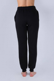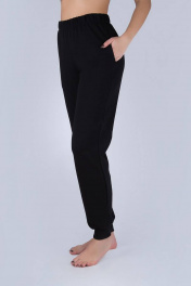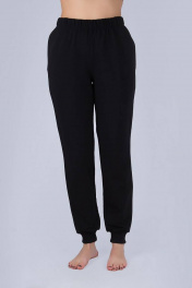 Брюки женские из футера (двухнитка). Пояс на резинке. В боковых швах обработаны карманы. Низ брюк обработан манжетами из трикотажного полотна "кашкорсе".